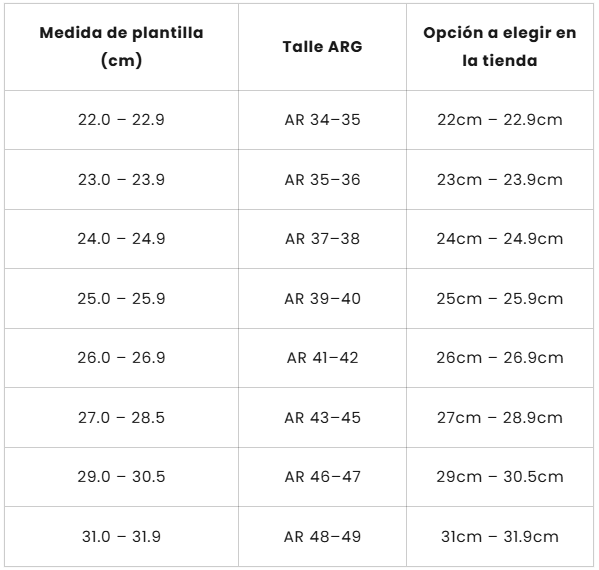 👉 Ejemplo: Si tu plantilla mide 28 cm, el talle que te corresponde es el que cubre el rango 27 cm – 28.5 cm.